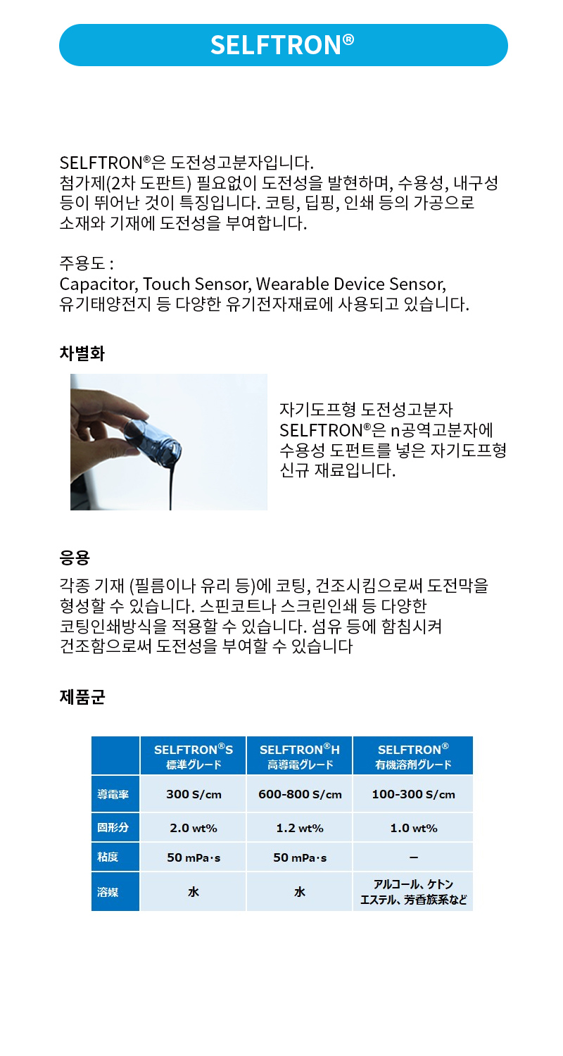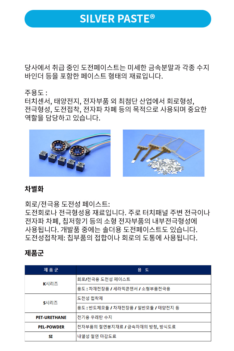 SELFTRON®은 도전성고분자입니다. Silver paste는 회로, 전극용 도전성페이스트 & 접착제로 사용되고 있습니다.